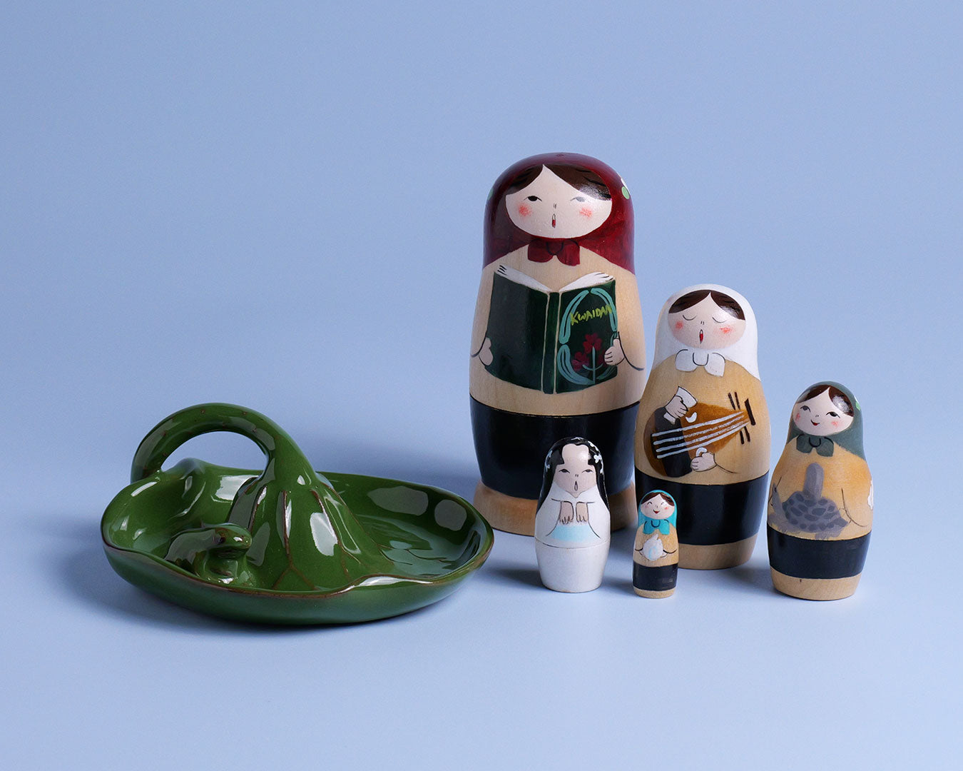 松江の工芸作家や窯元による作品のほか、小泉八雲ゆかりの作品も販売しております。例えば「怪談」シリーズをモチーフにしたマトリョーシカや松江の老舗和菓子屋「三英堂」ご考案の出西生姜を使用した新しい風味の琥珀糖。小泉八雲が好んだ廃ペン皿を松江の窯元・袖師窯が香立に写された「かえるの香立」など。ぜひご高覧くださいませ。